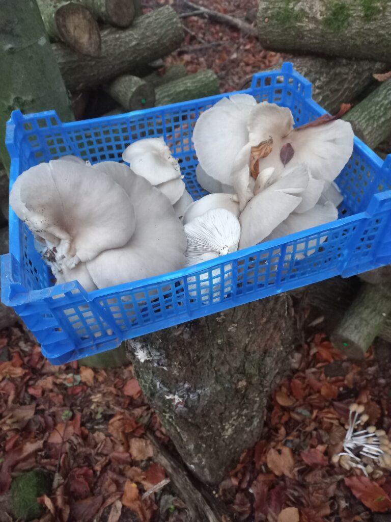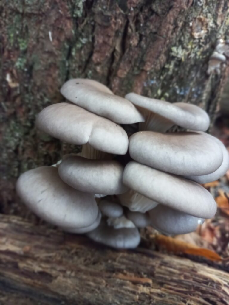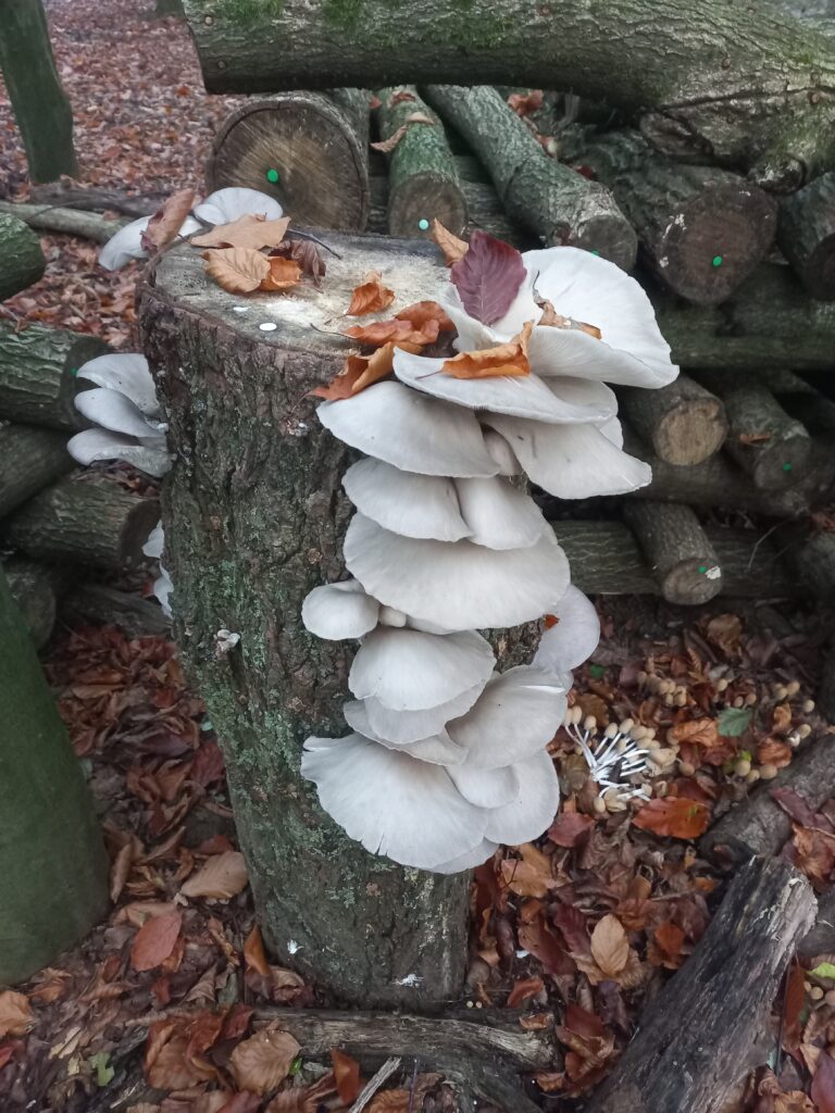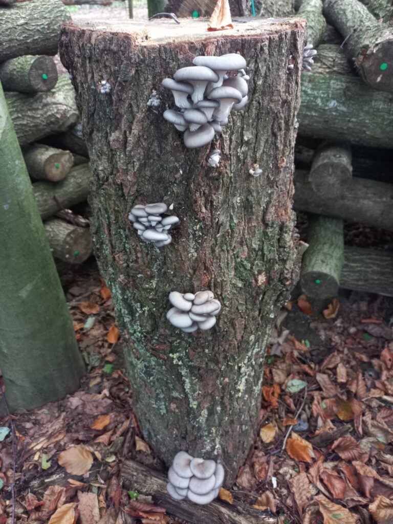 Ineens grijze oesterzwammen op een wilgenstam bij de Eetbaar Hout Kwekerij te zien – en niet een beetje….